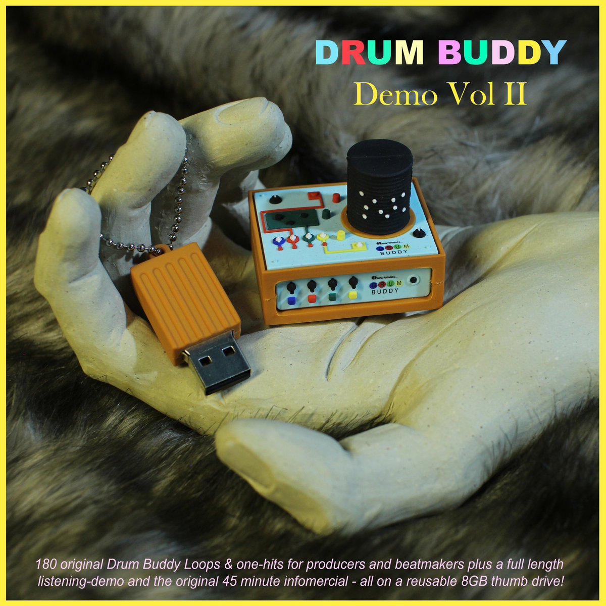 ALERT!! The cover art you are looking at is a photo of the actual USB album which you will receive in the mail ​- a tiny rubber 8GB thumb drive made from cast and colored layers of rubber to look exactly like the latest "Aqua-series" Drum Buddy. The USB works for both PC and Mac and contains over 180 original Drum Buddy Loops & one-hits for producers and beatmakers.
